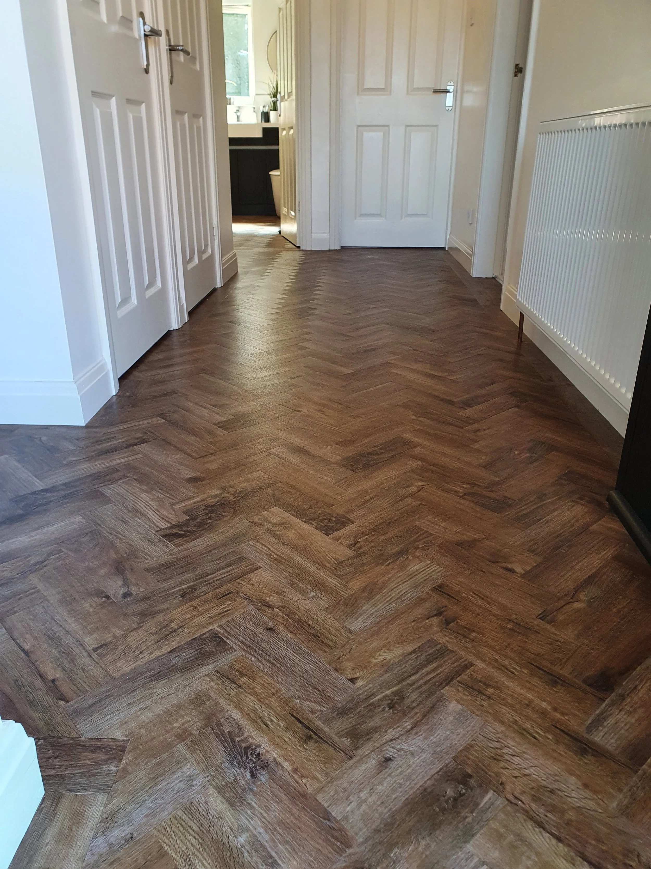 The design is a simple one tile border with the classic herringbone infill, The contrast of the dark oak to the pale walls really creates a modern contemporary feel. The tiles used were polyflor Camaro Georgian oak 2252.
